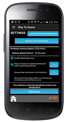 Hands Free AND Eyes Free travel alerts with NO registration required! Listen to your phone play Louisiana Department of Transportation and Development (LaDOTD) travel advisories near you, in your direction of travel. As you travel, it will automatically keep you updated.